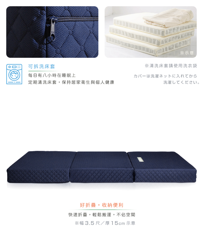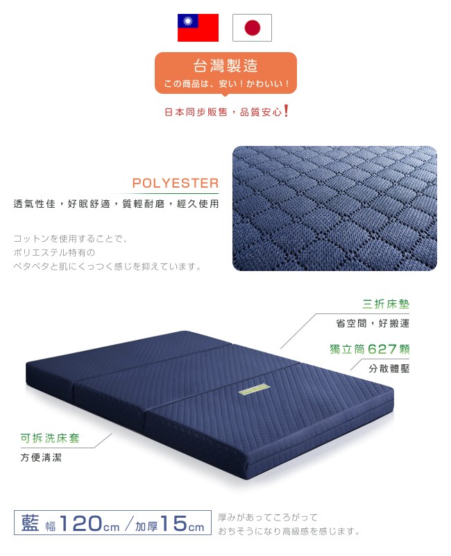 台灣製造,日本同步販售,品質安心。三折設計,方便展開與折疊床墊,快速簡單便可佈置完成。床墊厚度 15cm,加厚設計,省空間好收納。對於家裡的臥房、客房、兒童房來說,展開就是一張床,折疊起來就是一個座墊。POLYESTER 布料透氣性佳,好睡舒適,質輕耐磨,經久使用。依據 CNS 7447 國家標準,72B 鋼線獨立筒,具備韌性佳、結構強、耐用久,用於獨立筒床墊是最舒適的硬度。獨立的彈簧,分散體壓,各別配合身形而下沉,保持自然的睡姿,減輕骨骼的壓力。可拆洗床套便於清潔,避免塵蟎、細菌或過敏原滋生。