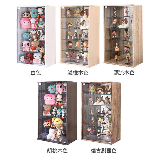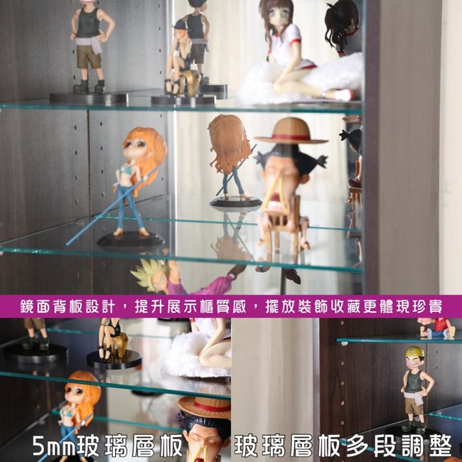讓公仔們有個家吧,放到展示櫃裡擺放觀賞,朋友來時可以一同分享收藏,同時也可以裝飾家中的角落,全高83cm讓您完美呈現收藏品,4片強化玻璃活動層版可自由調整讓擺放不受限,按壓式玻璃門採用5mm強化玻璃,既安全又美觀,還不用擔心灰塵髒汙附著。這款升級版將背板改為鏡面,公仔收藏品反射在鏡面上,明亮質感讓視覺效果更提升。讓小家庭可以輕鬆收納又不佔空間,此外整體板材使用低甲醛E1健康板材,讓您用的安心。不只可以放玩具公仔模型也可以當書櫃用或放小朋友的娃娃,如此多功能的櫃子,是家中不可或缺的好物。