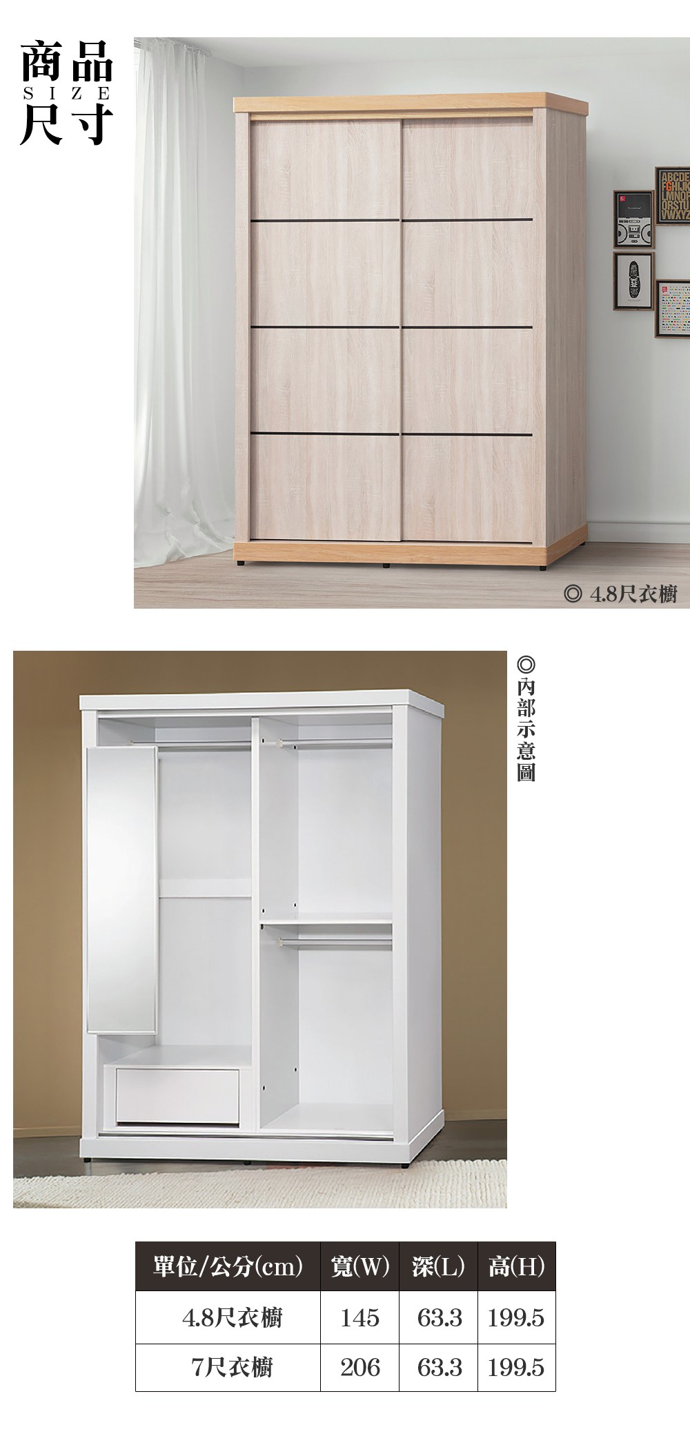全木心板、美背、門片ABS封邊、附側拉鏡