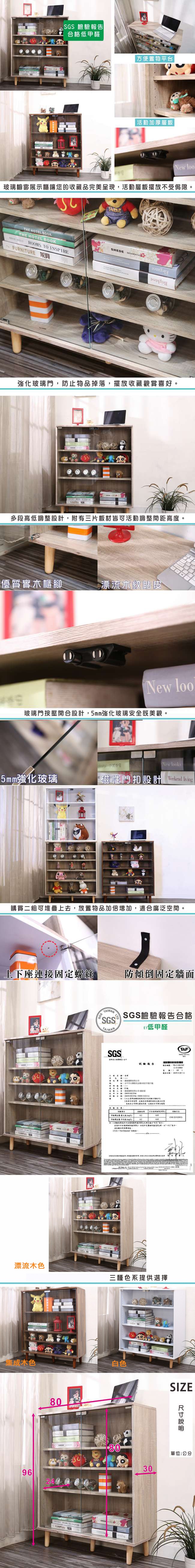 讓公仔們有個家吧!放到展示櫃裡擺放觀賞,朋友來時可以一同分享收藏,同時也可以裝飾家中的角落,全高96cm讓您完美呈現收藏品,3片活動層版可自由調整讓擺放不受限,按壓式玻璃門採用5mm強化玻璃,既安全又美觀,還不用擔心灰塵髒汙附著。讓小家庭可以輕鬆收納又不佔空間,此外整體板材使用低甲醛E1健康板材,讓您用的安心。不只可以放玩具公仔模型也可以當書櫃用或放小朋友的娃娃,如此多功能的櫃子,是家中不可或缺的好物。