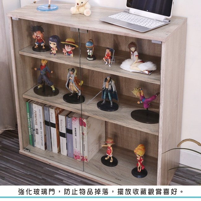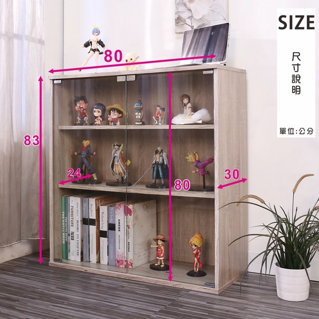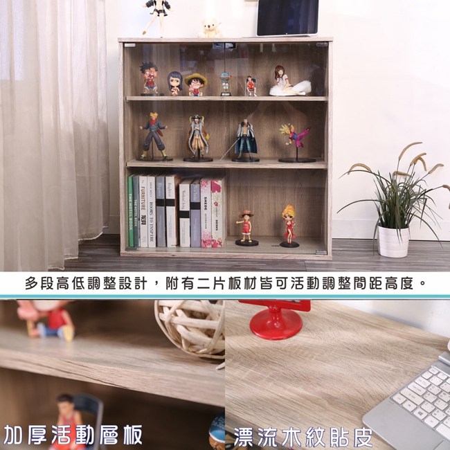 讓公仔們有個家吧!放到展示櫃裡擺放觀賞,朋友來時可以一同分享收藏,同時也可以裝飾家中的角落,全高83cm讓您完美呈現收藏品,2片活動層版可自由調整讓擺放不受限。讓小家庭可以輕鬆收納又不佔空間,此外整體板材使用低甲醛E1健康板材,讓您用的安心。不只可以放玩具公仔模型也可以當書櫃用或放小朋友的娃娃,如此多功能的櫃子,是家中不可或缺的好物。