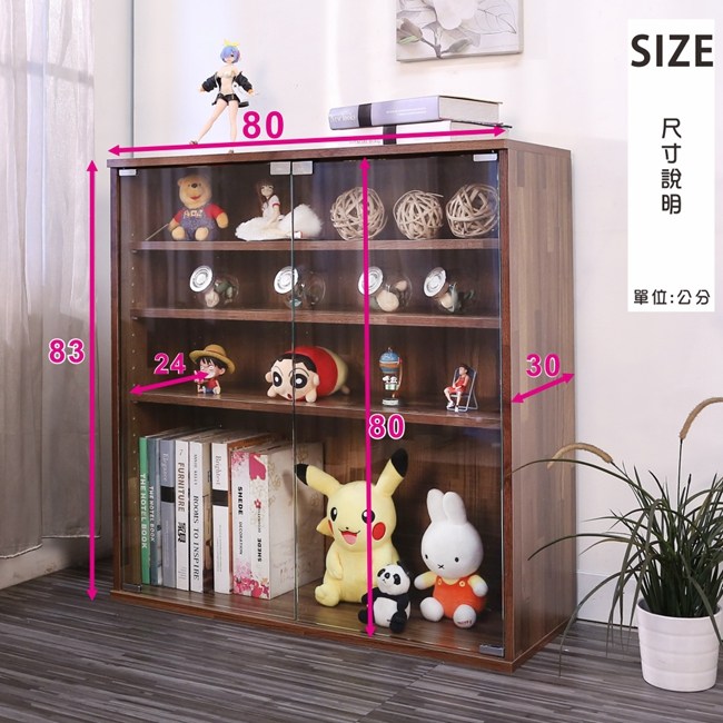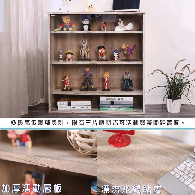 讓公仔們有個家吧!放到展示櫃裡擺放觀賞,朋友來時可以一同分享收藏,同時也可以裝飾家中的角落,全高83cm讓您完美呈現收藏品,3片活動層版可自由調整讓擺放不受限。讓小家庭可以輕鬆收納又不佔空間,此外整體板材使用低甲醛E1健康板材,讓您用的安心。不只可以放玩具公仔模型也可以當書櫃用或放小朋友的娃娃,如此多功能的櫃子,是家中不可或缺的好物。