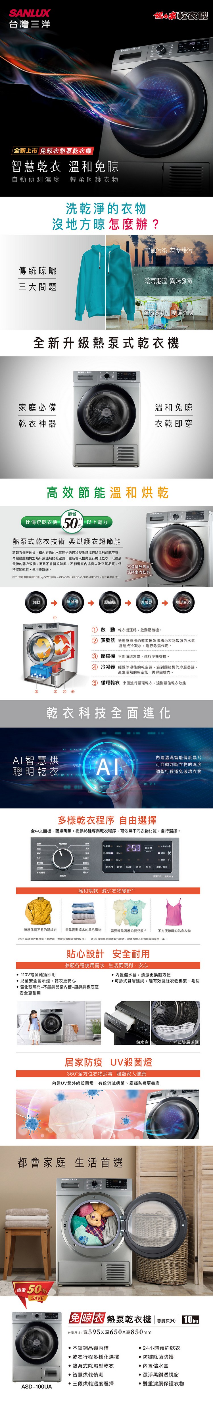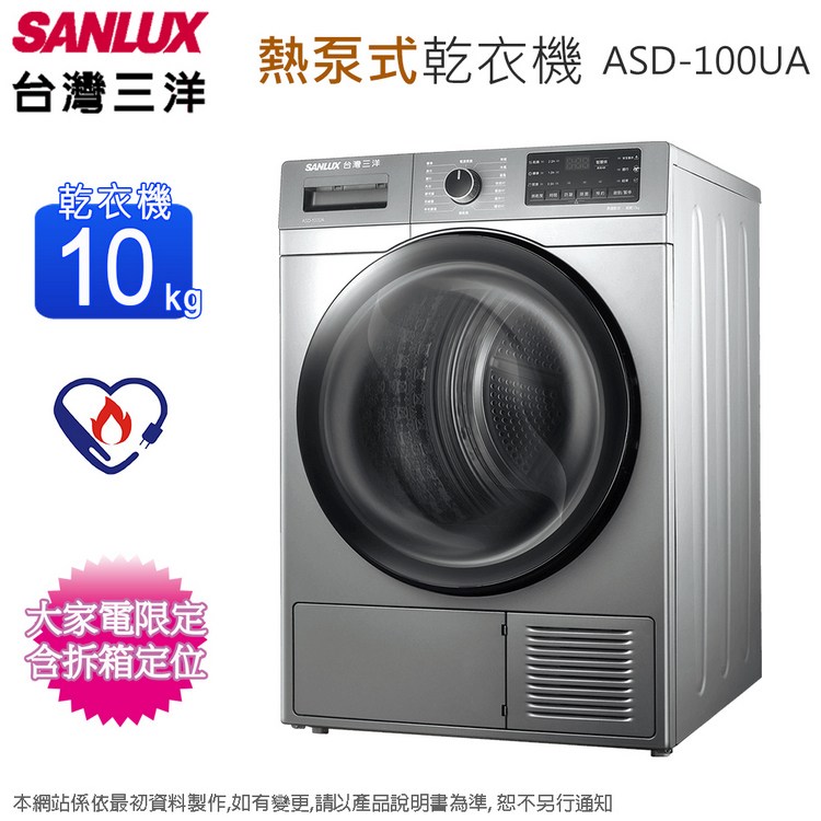 SANLUX台灣三洋10公斤熱泵式不鏽鋼內槽乾衣機 ASD-100UA~含拆箱定位