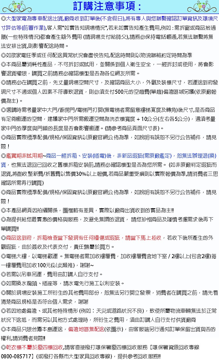 ◎請務必在購買之前,先丈量現場空間尺寸,及確認商品大小,外觀及裝機尺寸,若運送到府發現尺寸不適或個人因素不符導致退貨,則必須支付500元的空趟費(單趟)偏遠區域另議(依原廠報價為主)。