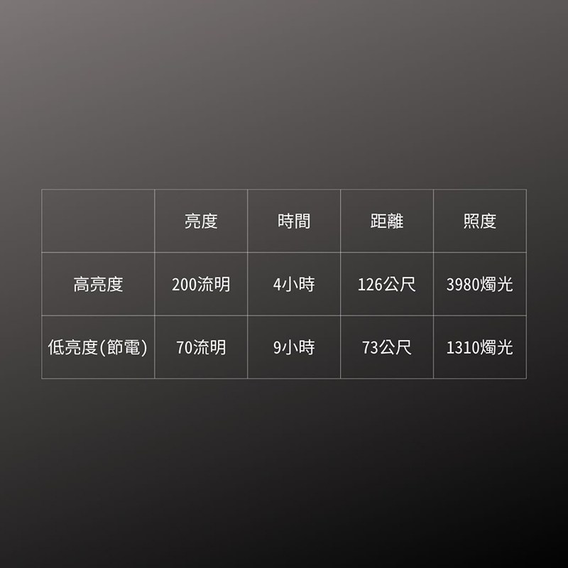 高亮度模式 200流明 - 4小時 126公尺