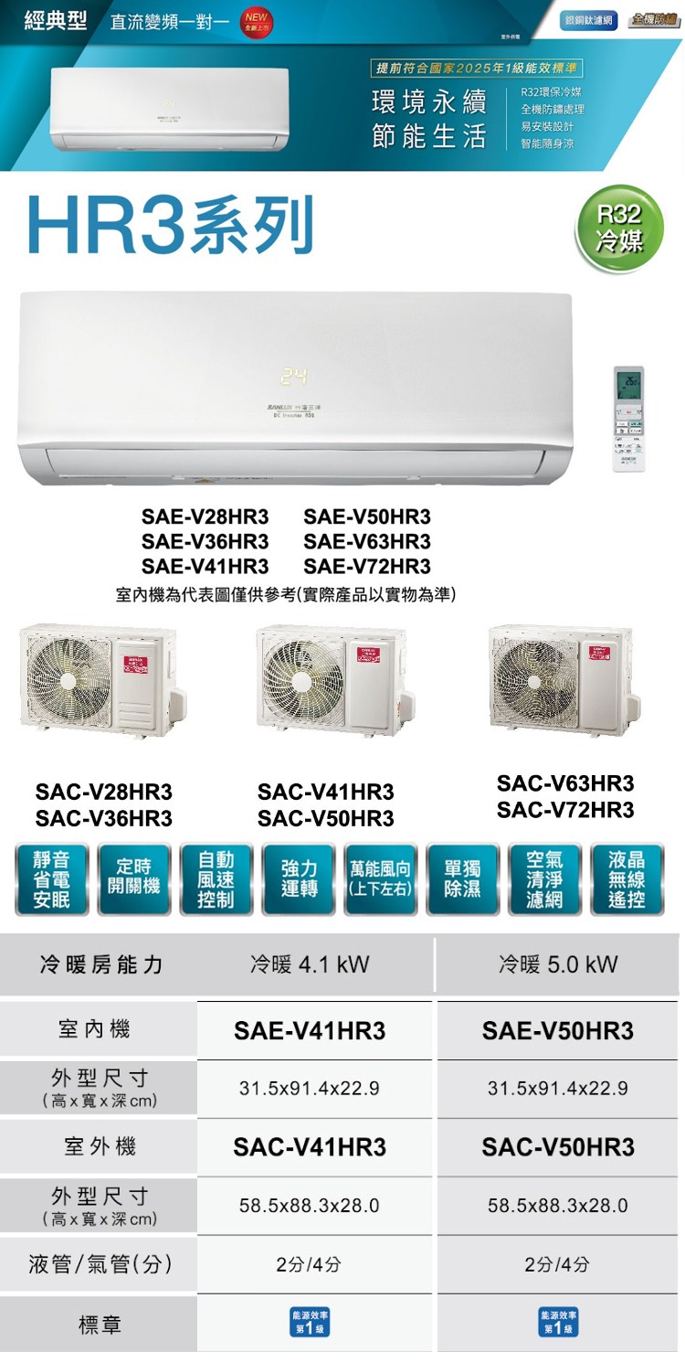SANLUX台灣三洋7-8坪一級變頻冷暖分離式冷氣 SAE-V50HR3+SAC-V50HR3~含基本安裝+舊機回收