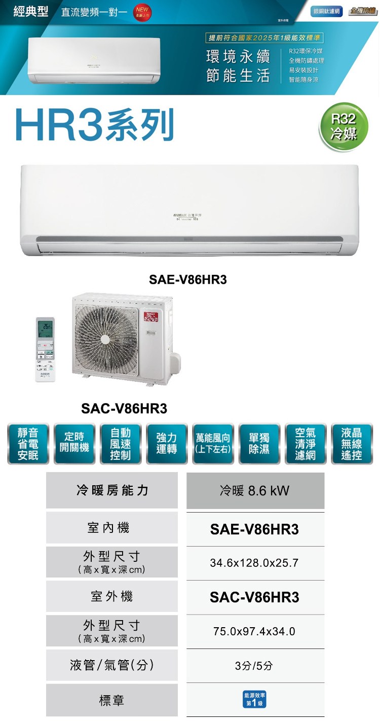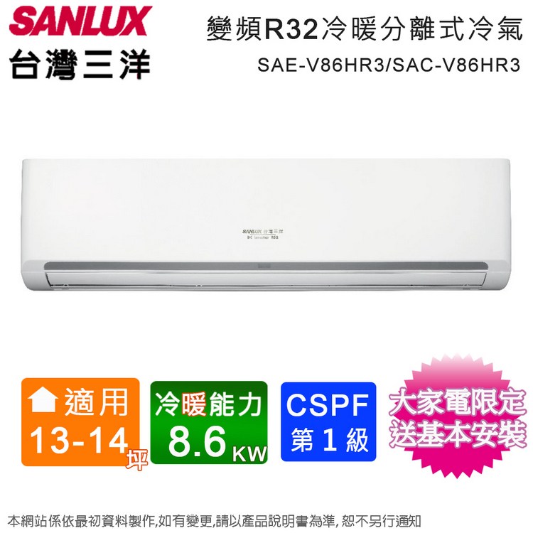 SANLUX台灣三洋13-14坪一級變頻冷暖分離式冷氣 SAE-V86HR3+SAC-V86HR3~含基本安裝+舊機回收