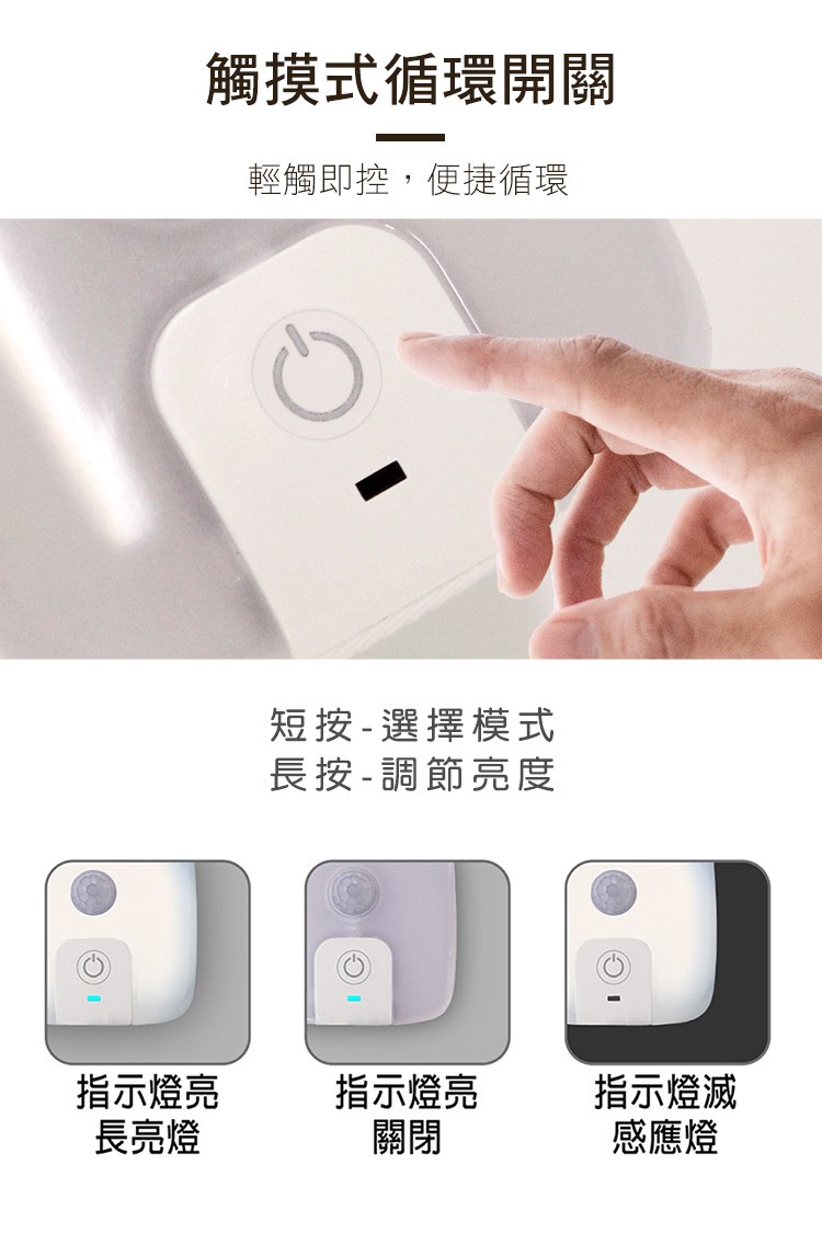 ◆觸摸式循環開關:短按-長亮燈→關閉→感應燈;長按-調節亮度。