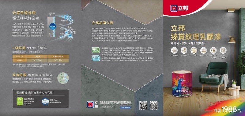 Nippon Paint立邦塗料秉持環保健康! 淨味無添加,分解空氣中游離甲醛,轉化為水分子排出。調色系列獨家採用最高級環保的ECO999淨味色漿,從裡到外給您淨味居家。全產品不添加鉛、汞及其他化合物,VOC(揮發性有機化合物)含量均符合嚴格的國際標準,更多產品獲得美國Greenguard與FDA食品接觸級認證,不只刷新生活,更守護全家真健康。