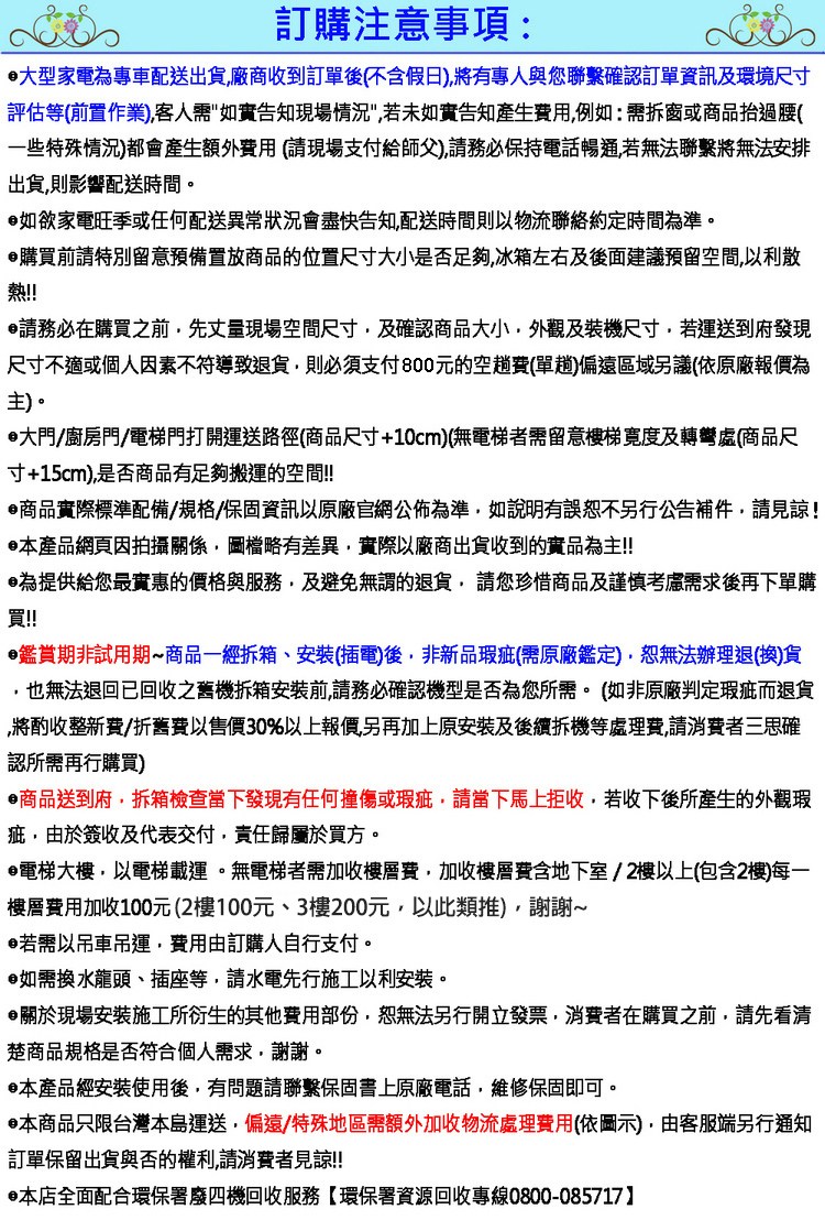 ◎請務必在購買之前,先丈量現場空間尺寸,及確認商品大小,外觀及裝機尺寸,若運送到府發現尺寸不適或個人因素不符導致退貨,則必須支付800元的空趟費(單趟)偏遠區域另議(依原廠報價為主)。