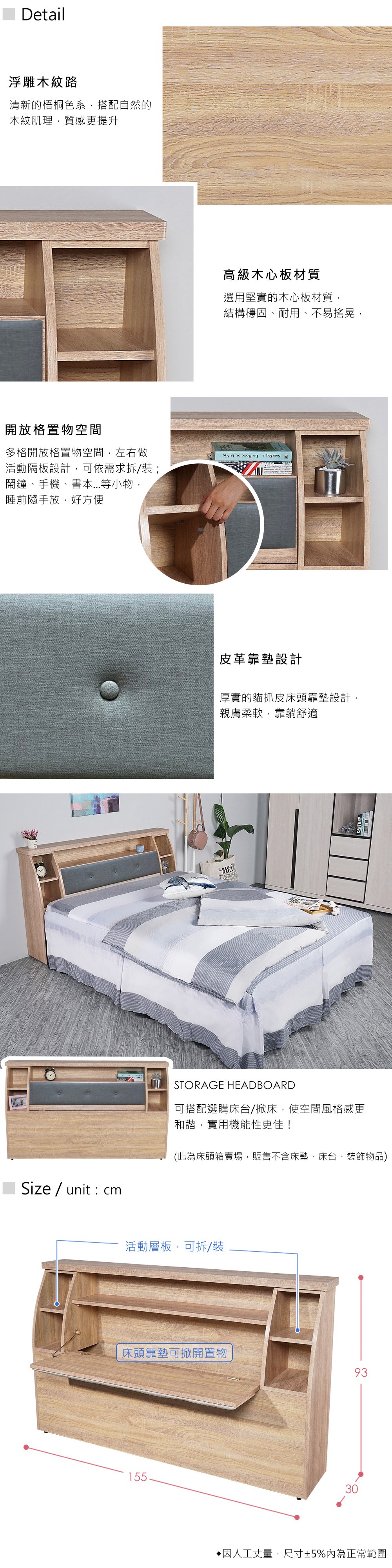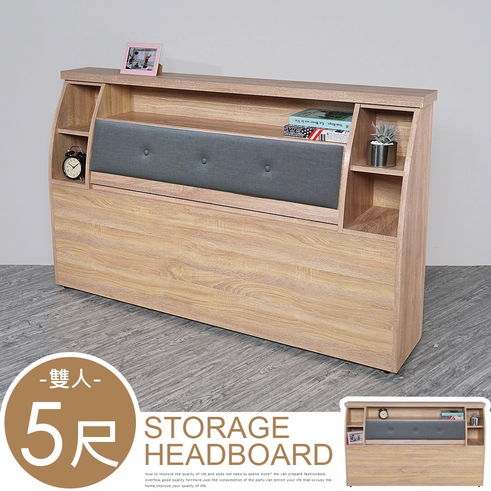 傢俱工場-吉米 防潮全木心板 插座收納床頭箱 - 雙人5尺古橡
