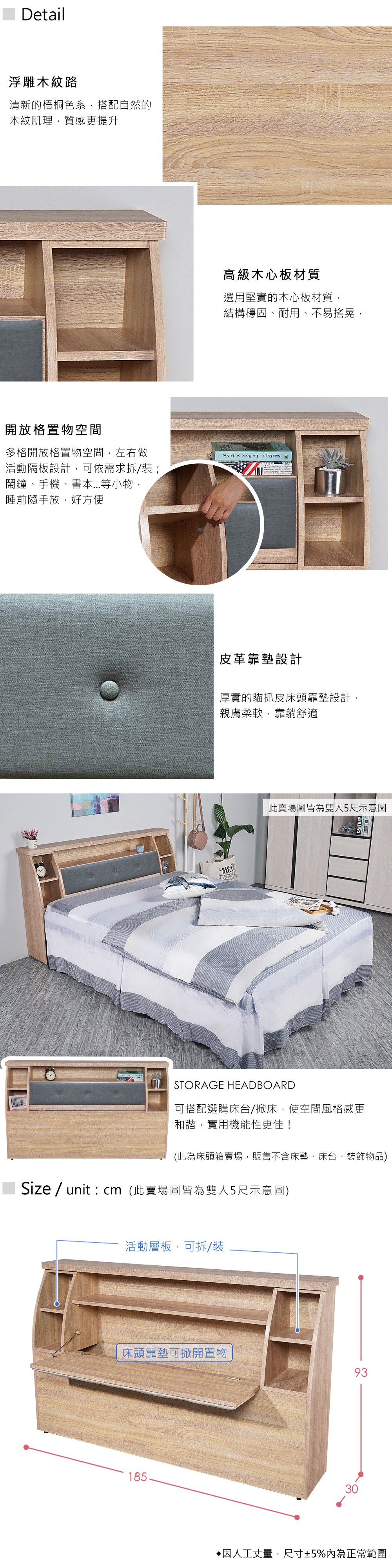 傢俱工場-吉米 防潮全木心板 插座收納床頭箱 - 雙人5尺古橡