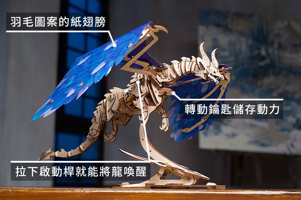要賦予這個模型生命只需旋轉龍胸前的鑰匙,並拉動啟動桿來釋放動力。
