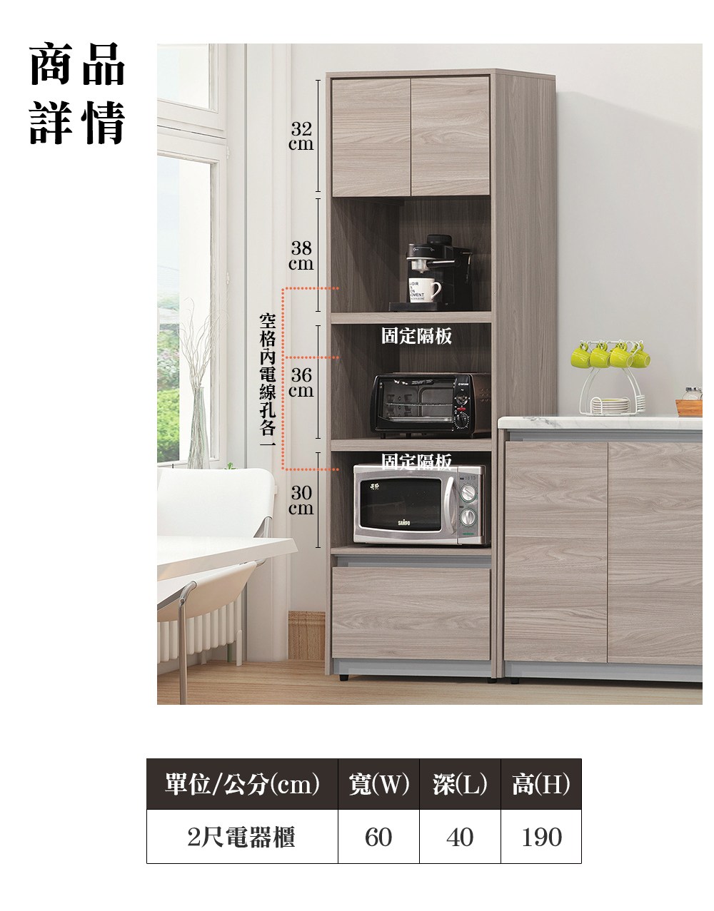 Boden-潔妮2尺收納高餐櫃/碗盤櫃/拉盤電器櫃-60x40x180cm