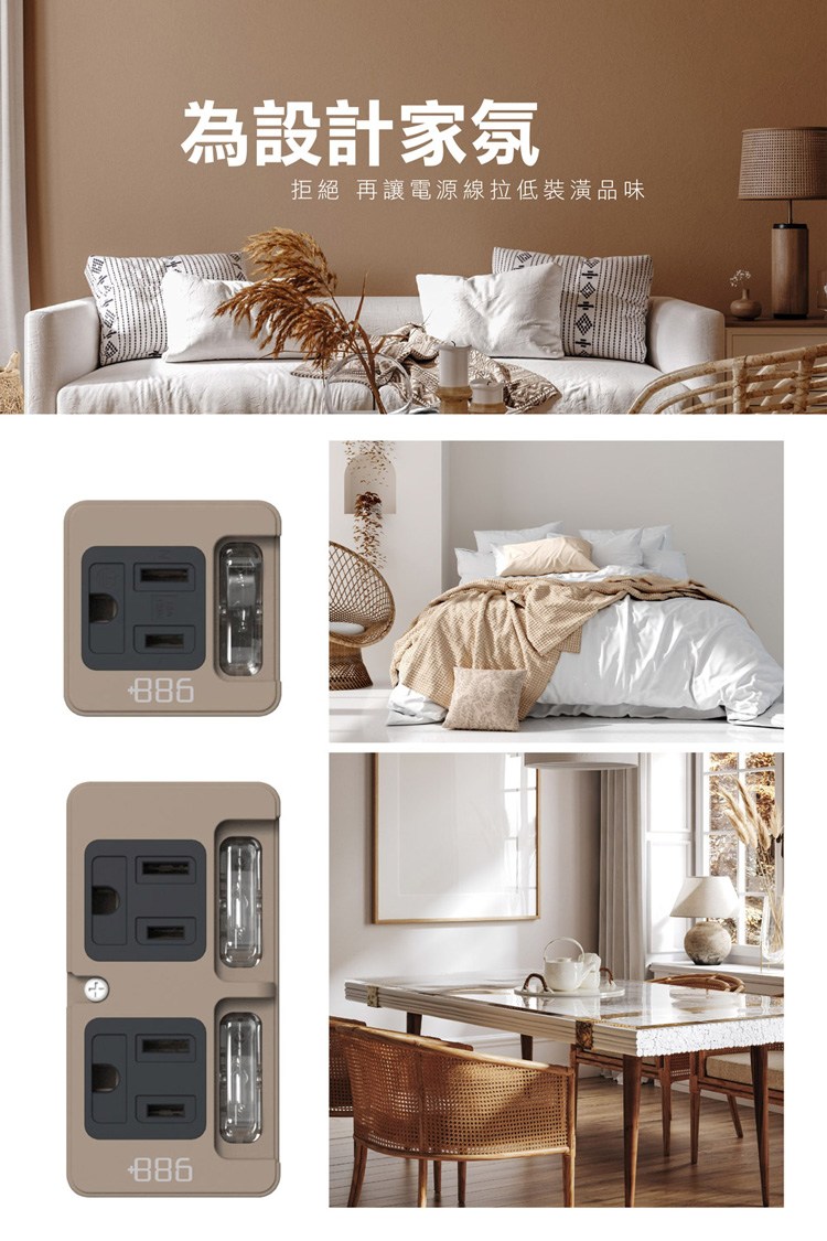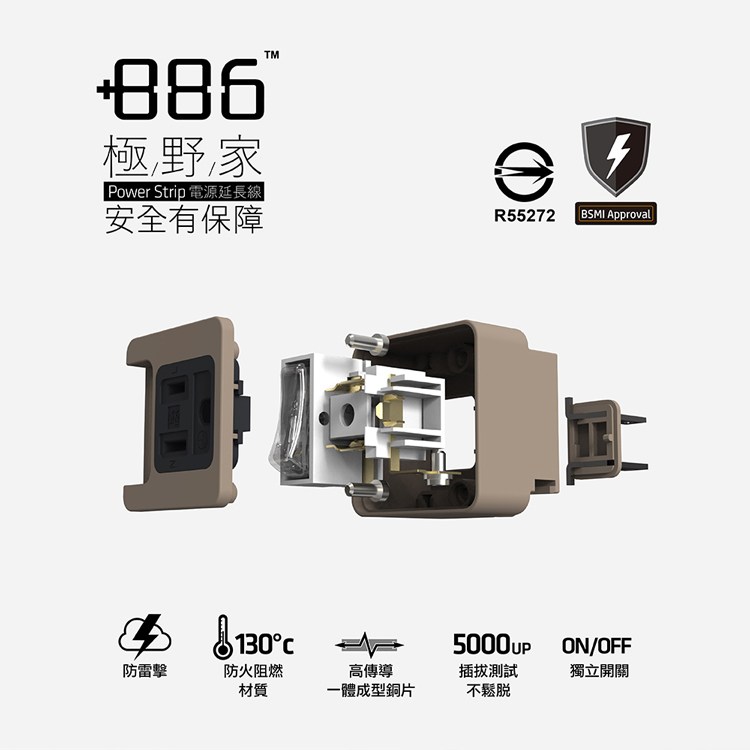 +886 [極野家] 1開1壁插/防雷擊 (奶茶棕)