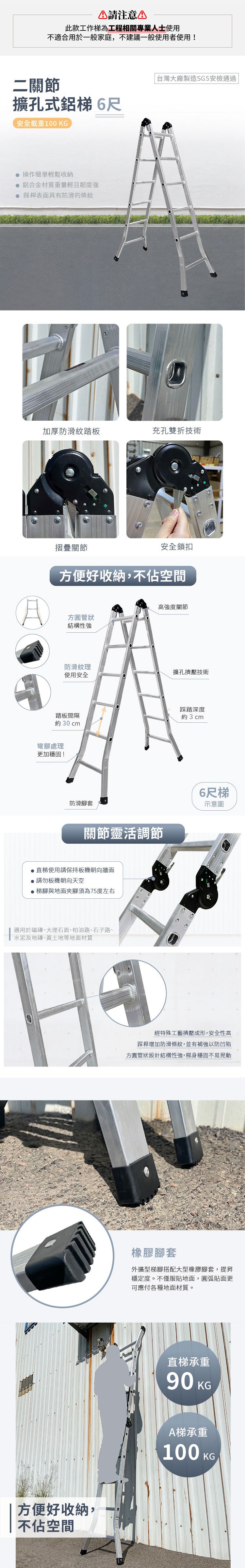 【大船回港】二關節擴孔式鋁梯-6尺