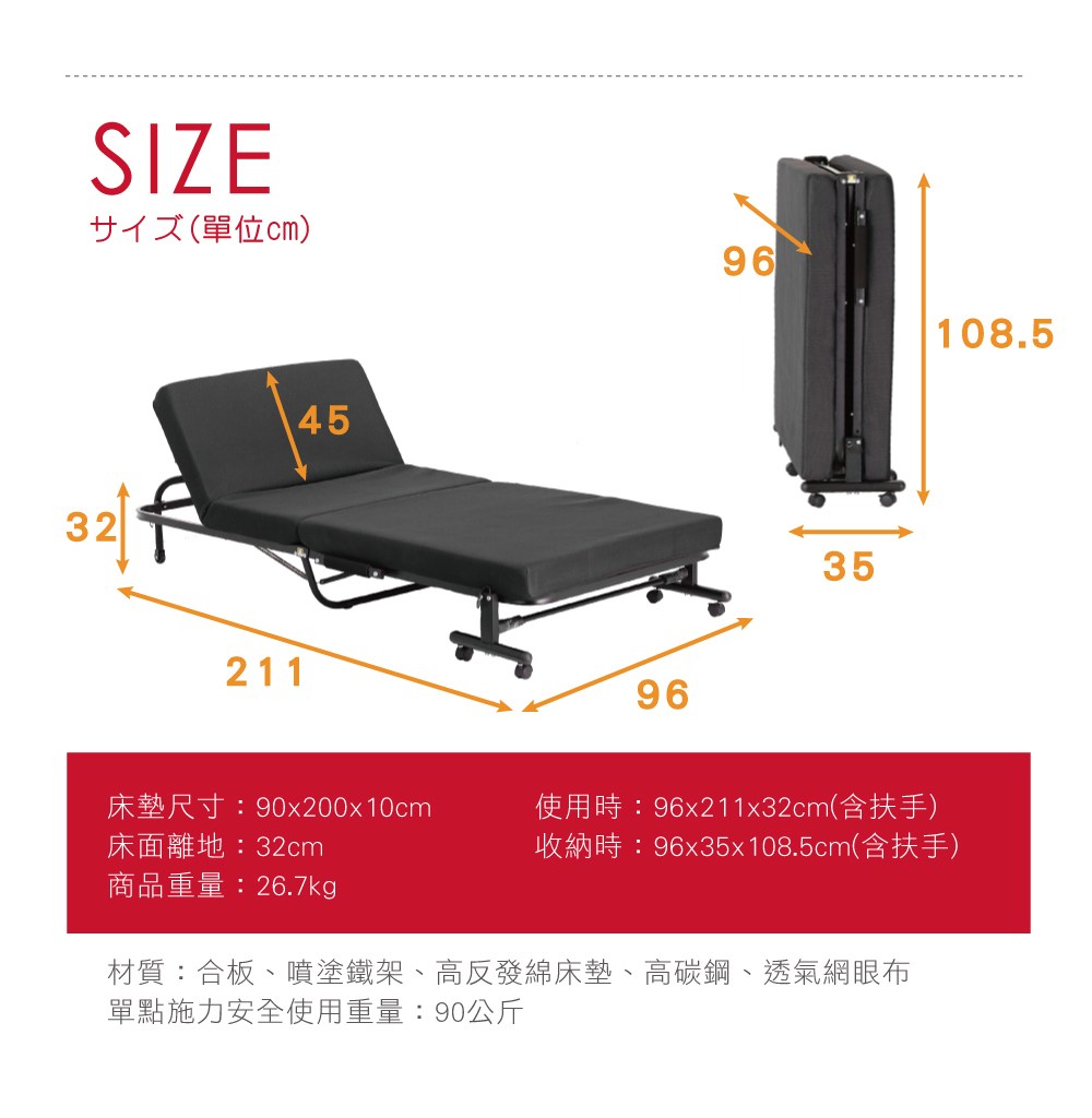 HappyLife 固定扶手折疊床 190×90×32cm Y11362