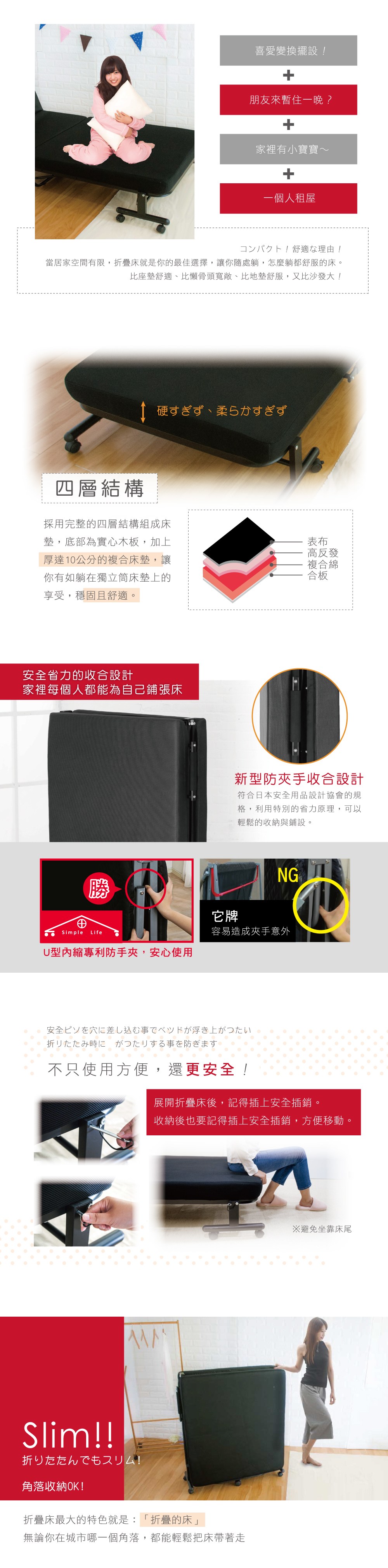 【Simple Life】高反發支撐14段收納折疊床(簡易組)KR黑黑