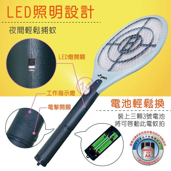 驚雷 電蚊拍 BH305 USB充電 21.5 x 51.5cm 綠色