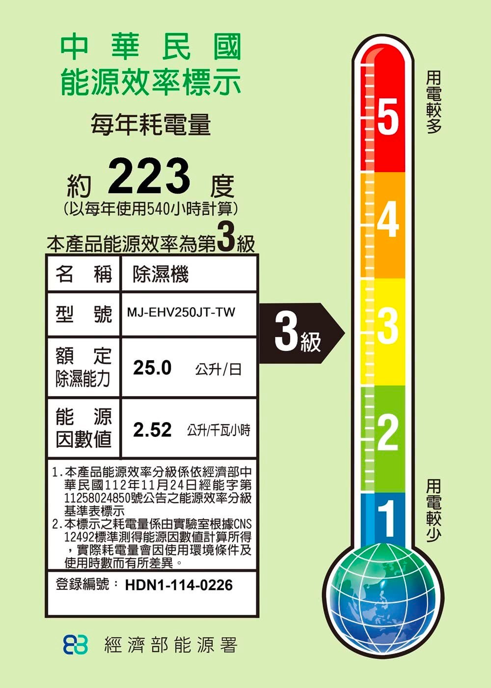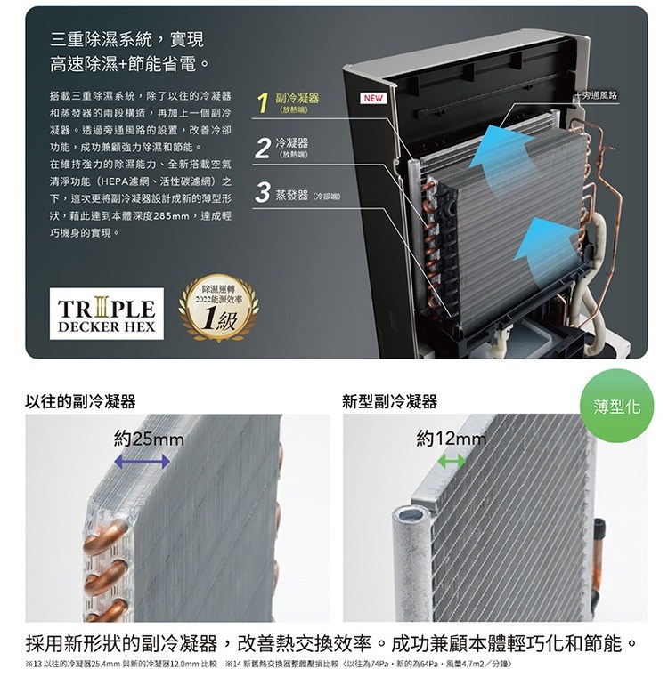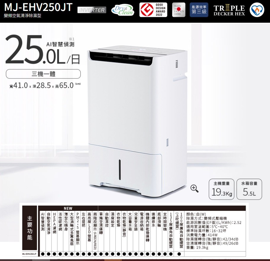除濕能力:25 L/日(室溫27°C、相對溫度60%時)