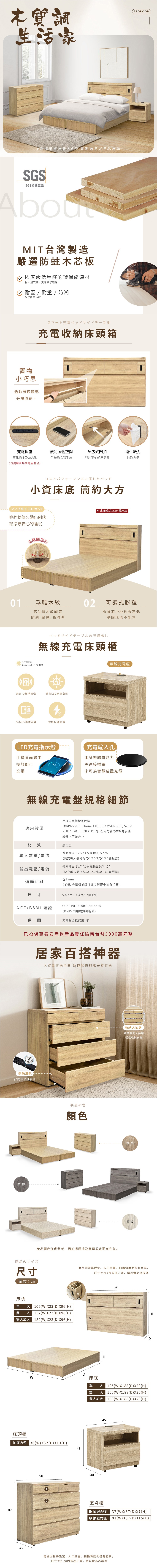 傢俱工場-吉米 MIT木心板床組 (插座床箱+床底) - 雙人5尺梧桐