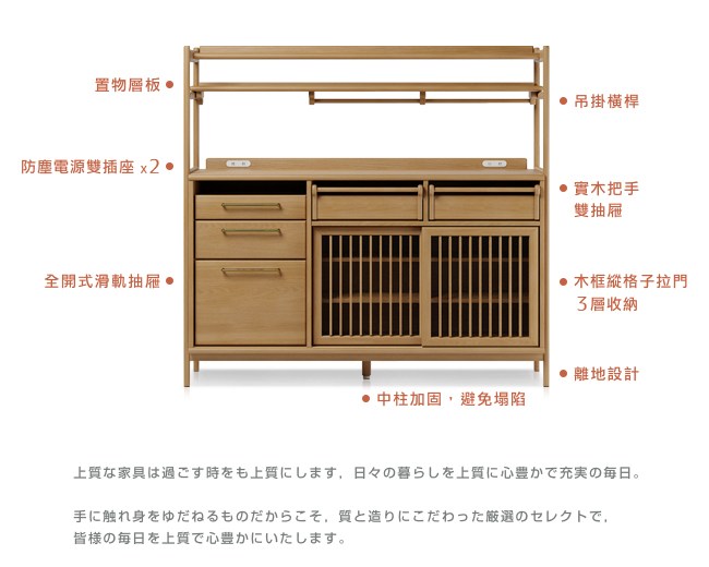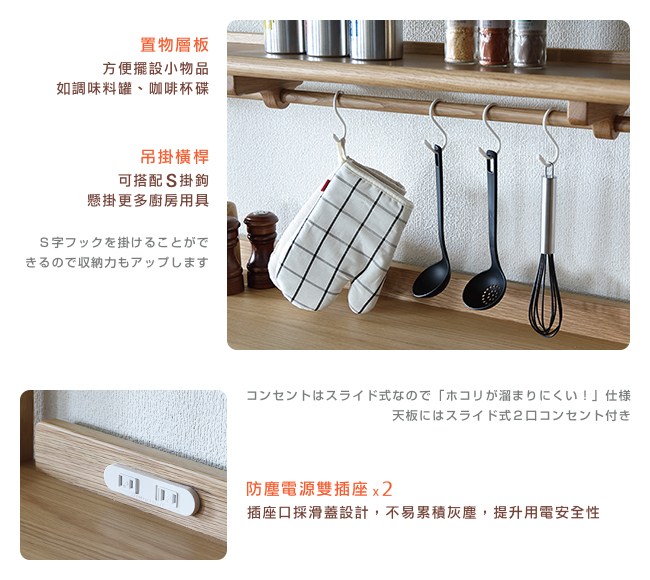 珍貴稀少的白橡木,山形木紋清晰優美,質感與觸感極好,質地硬沉,經久使用。頂部的置物層板,方便擺設小物品,如調味料罐、咖啡杯碟等。其中的吊掛橫桿,可搭配S掛鉤,懸掛更多廚房用具。左右兩側的電源插座,採用滑蓋設計,不易累積灰塵,提升用電安全性。桌面邊緣圓角防碰傷、刮傷肌膚。實木把手好抓握,開關抽屜順暢省力,亦可作為毛巾掛架。全開式滑軌抽屜,輕鬆放入與取出物品,並有很好的承重力,即使放滿東西,也不必擔心抽屜塌陷。實木腳堅固穩定,中柱加固,安全耐用,離地 11cm 便於打掃,可讓掃地機器人通過。