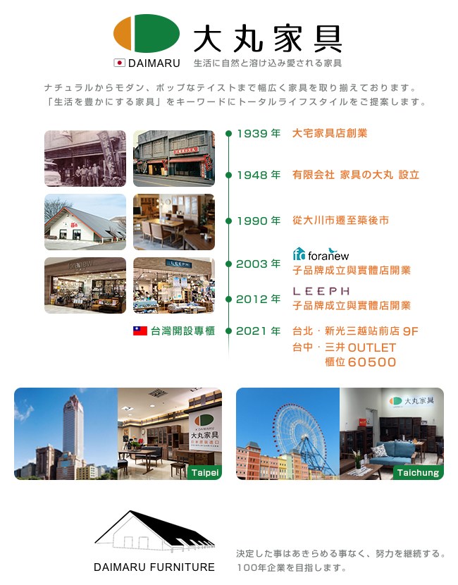 1939 年創業,2003 年子品牌「foranew」成立、2012 年子品牌「LEEPH」成立,2021 年在台灣設立專櫃。秉持著「豐富生活的家具」為原則,主要嚴選 500 年生的北美黑胡桃木來製造家具,我們希望滿足每個人對於居家的需求,設計出更令人喜愛的高品質家具。我們會繼續努力,讓家具與時俱進、推陳出新,立志成為百年歷史的公司,並堅持嚴謹的生產過程,只給客人最好的家具。