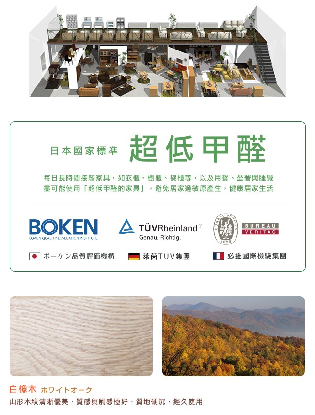 每日長時間接觸家具,如衣櫃、櫥櫃、碗櫃等,以及用餐、坐著與睡覺,盡可能使用「超低甲醛的家具」,避免居家過敏原產生。大丸家具通過日本 BOKEN、德國萊茵 TUV 集團、法國必維國際檢驗集團與多國安全認證,確保每一個家具都是最高品質,符合日本國家標準「超低甲醛」,讓居家環境健康舒適。