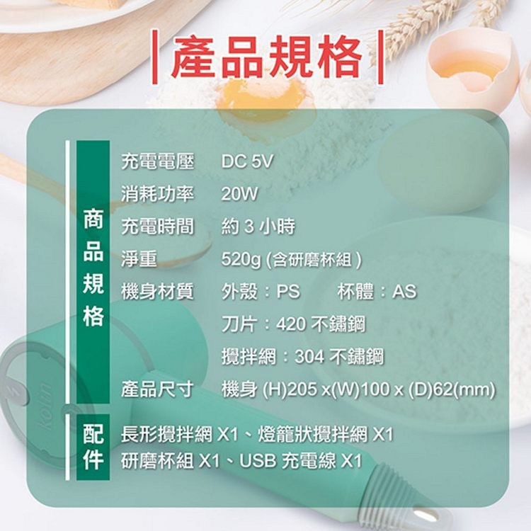 Kolin歌林 無線多功能切碎打蛋器.攪拌器-3件組 KJE-HC620