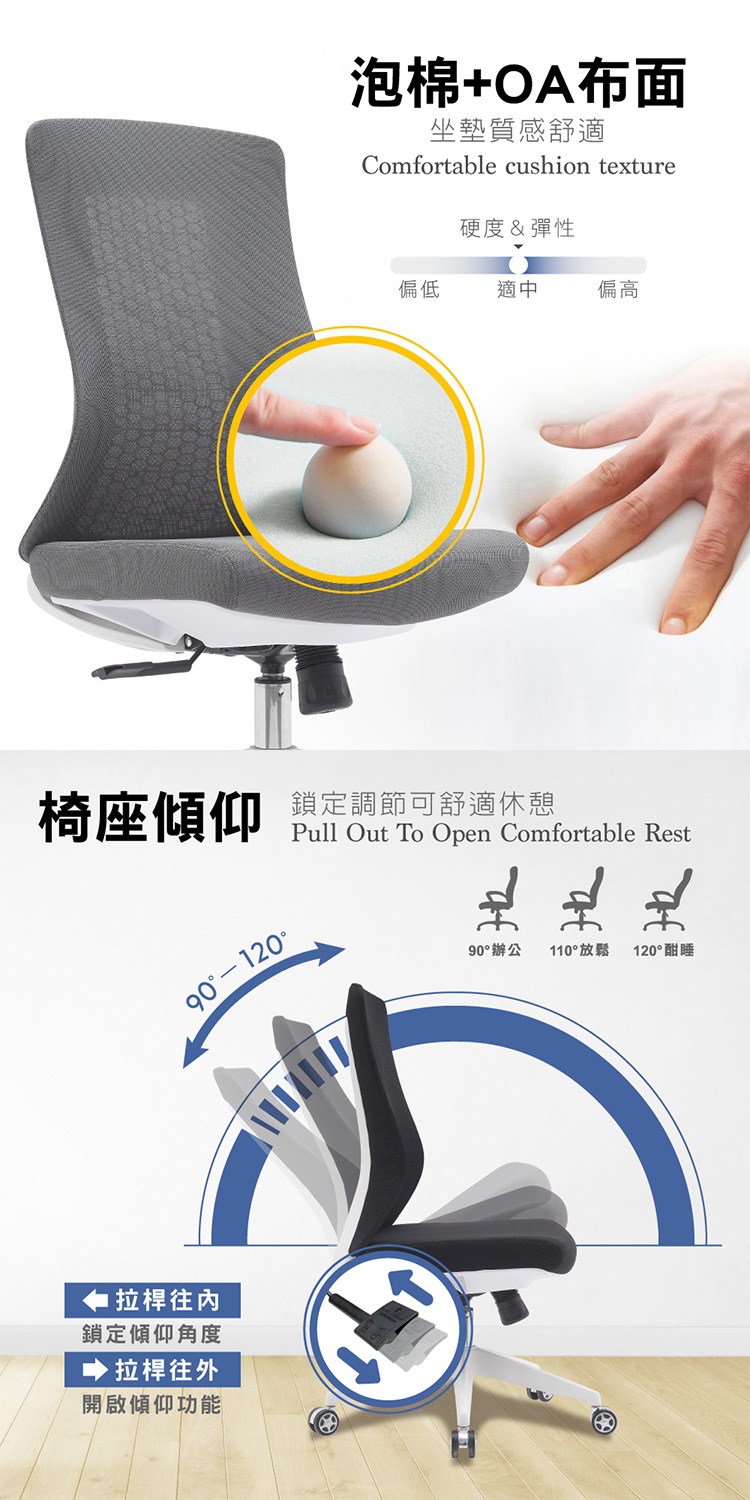 台灣與歐美同步販售、美規設計,透氣度高之網布椅背,涼爽乘坐,獨特蜂巢椅背採塑膠射出支撐佳,包覆OA布之成型泡棉、坐感適中,