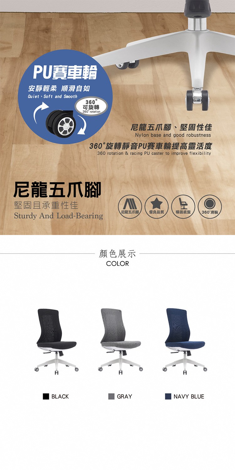 材質:網布 + 塑膠射出 + 尼龍五爪腳 + PU滑輪