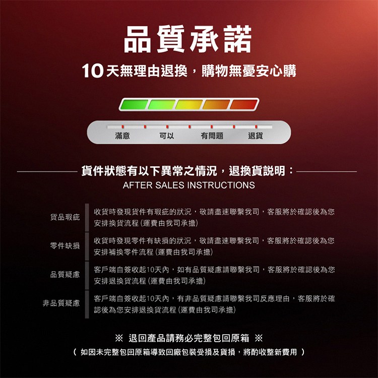 商品如一經組裝後,一律不接受退貨,退貨商品請使用原箱包裝包回,如有缺少配件或紙箱破損與紙箱塗鴉字樣(將無法完成退貨程序)或則需支付整新與包材費用。