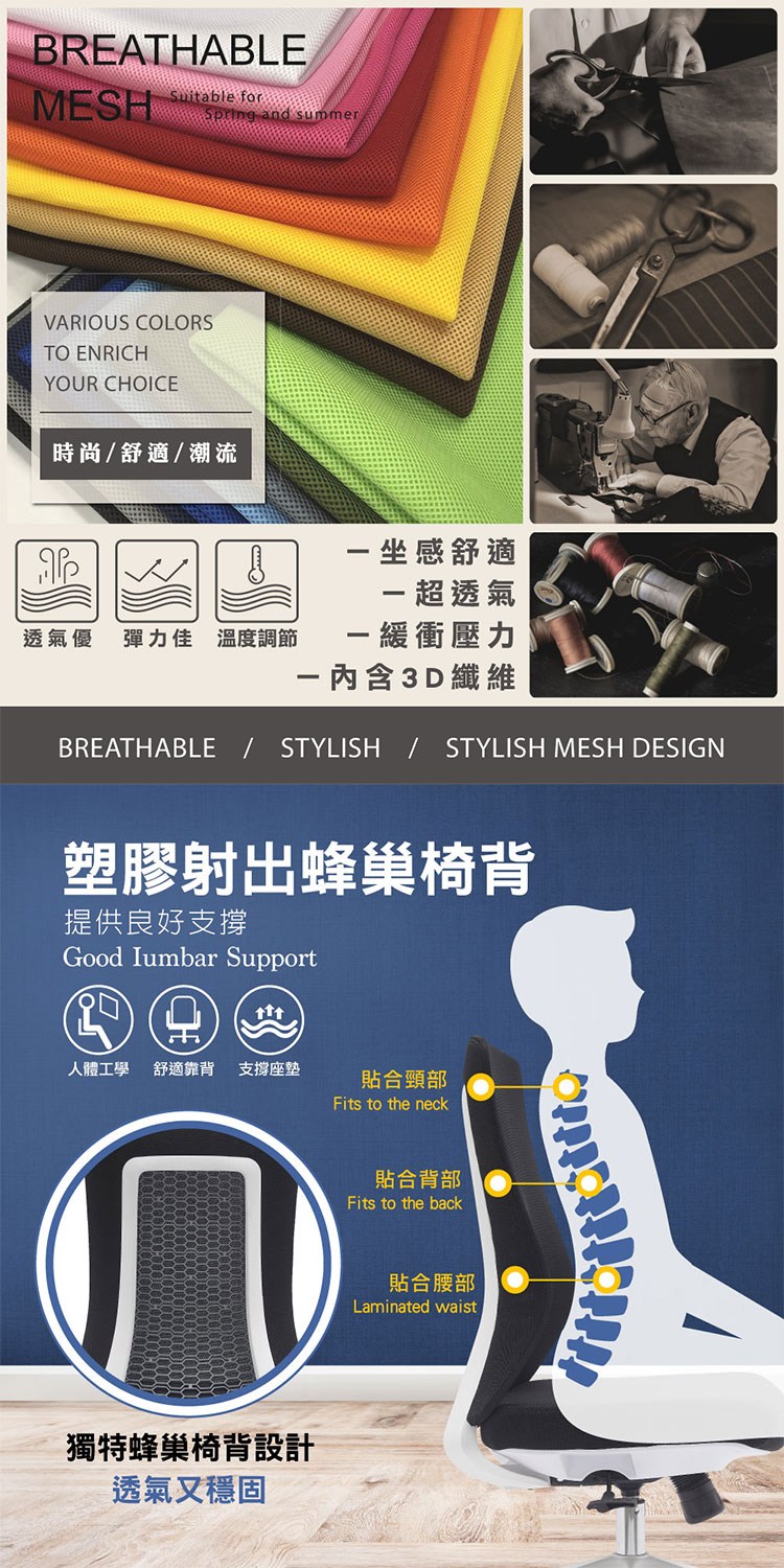 * 獨特蜂巢椅背採塑膠射出支撐佳
