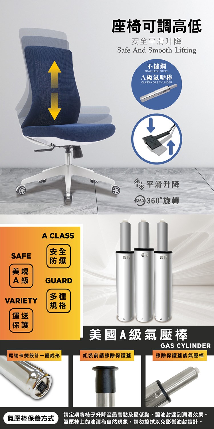 椅座傾仰鎖定調節,可舒適休憩,配備美規A級氣壓棒、安全升降,採尼龍五爪腳,堅固且承重性佳,靜音PU賽車輪、美觀且防刮地板,