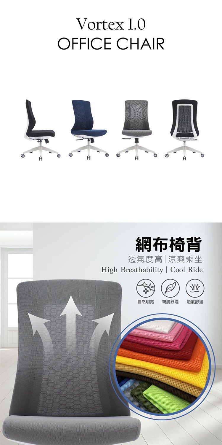 * 透氣度高之網布椅背,涼爽乘坐