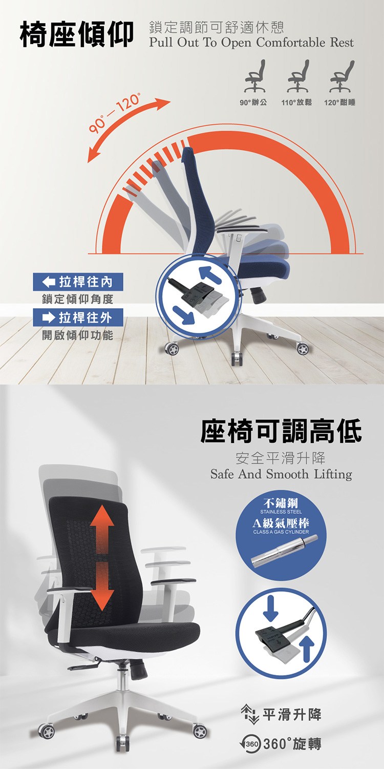 包覆OA布之成型泡棉、坐感適中,椅座傾仰鎖定調節,可舒適休憩,配備美規A級氣壓棒、安全升降,採尼龍五爪腳,堅固且承重性佳,