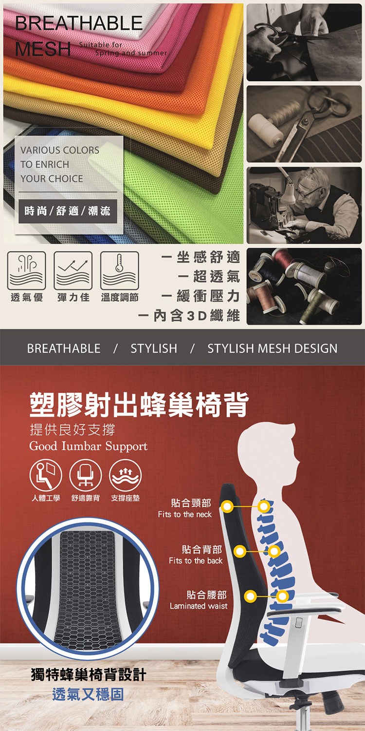 * 獨特蜂巢椅背採塑膠射出支撐佳
