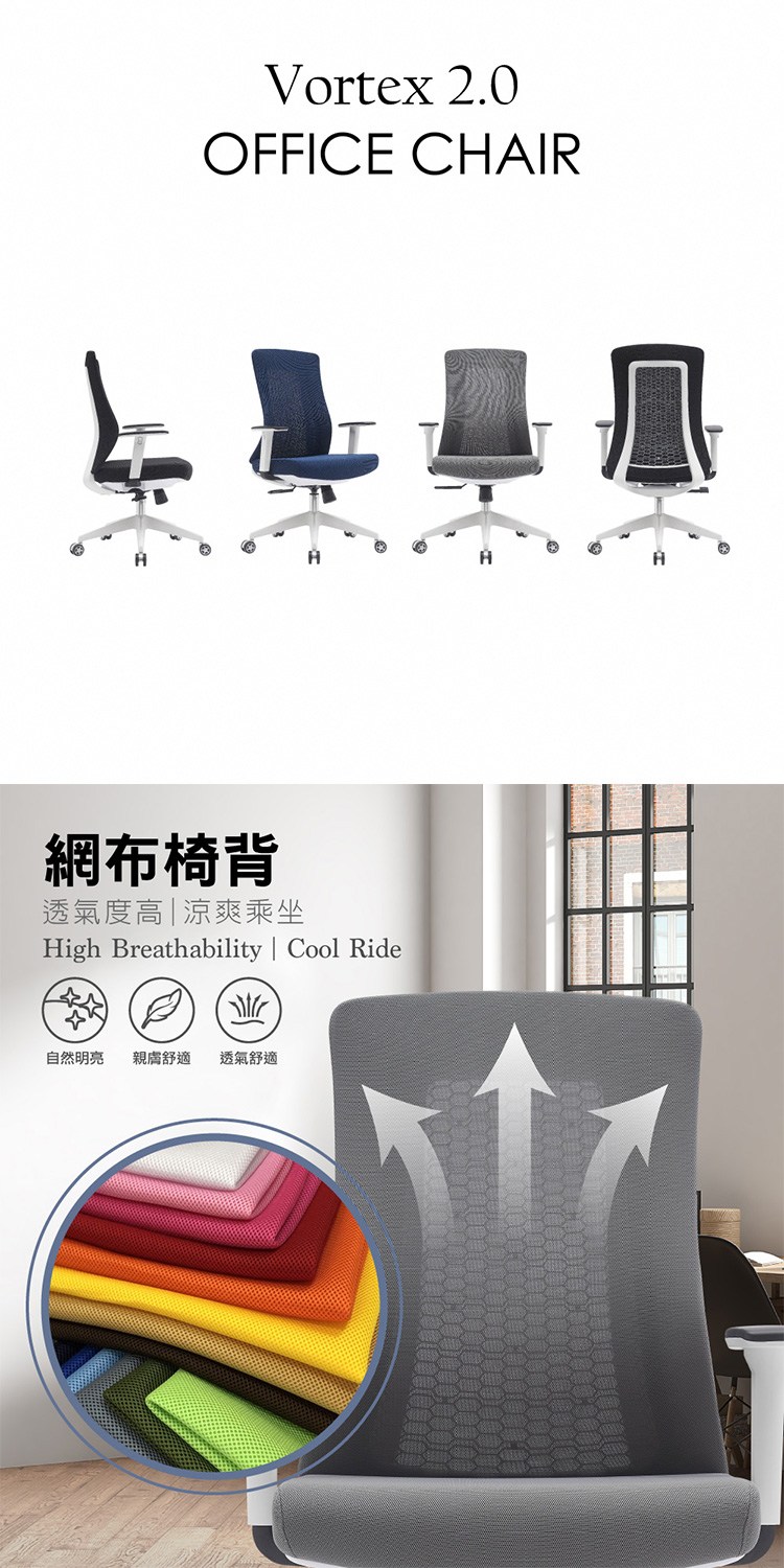 [E-home]Vortex 2.0 旋流白框中背半網扶手人體工學電腦椅,具備時尚又現代感的造型辦公椅,商務空間最亮麗的擺設,讓您工作事半功倍。
