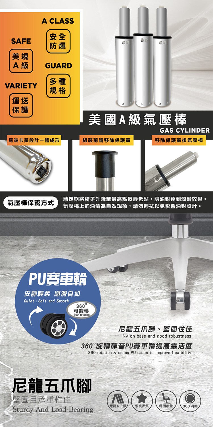 包覆OA布之成型泡棉、坐感適中,椅座傾仰鎖定調節,可舒適休憩,配備美規A級氣壓棒、安全升降,採尼龍五爪腳,堅固且承重性佳,