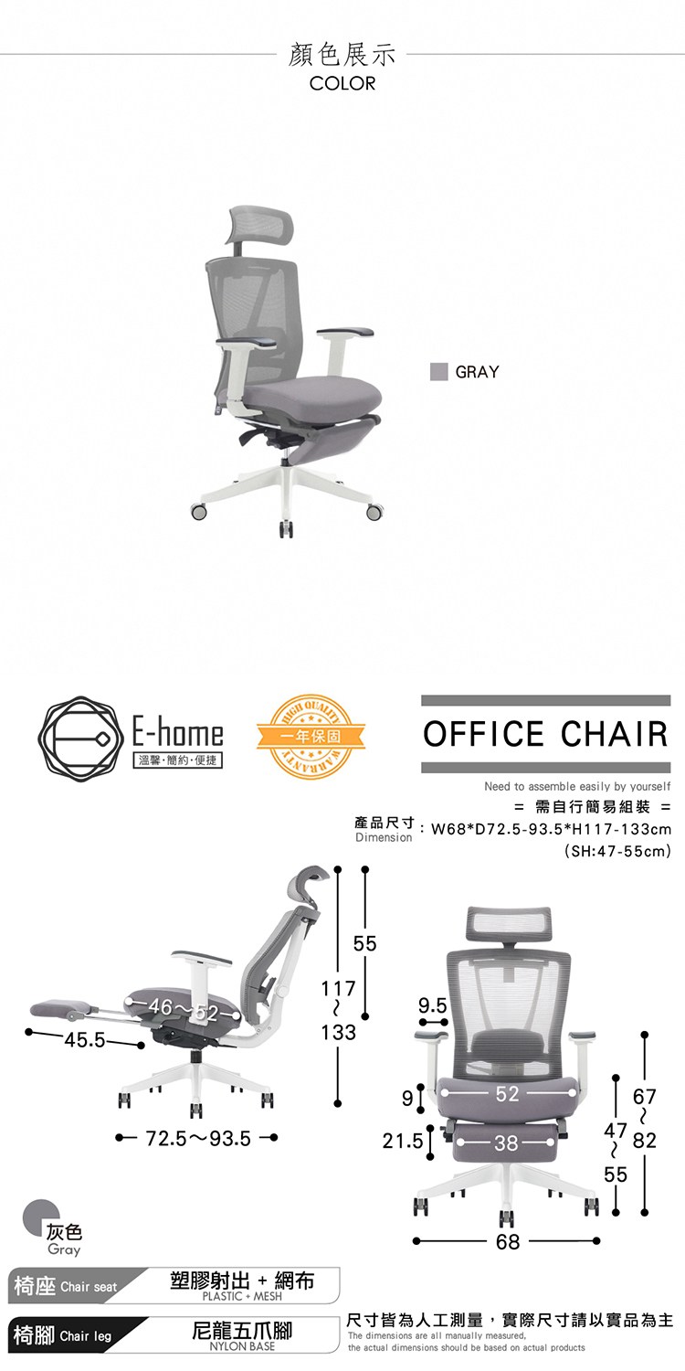 E-home Falsita法希塔意式高階底盤半網含腳凳人體工學電腦椅-灰色