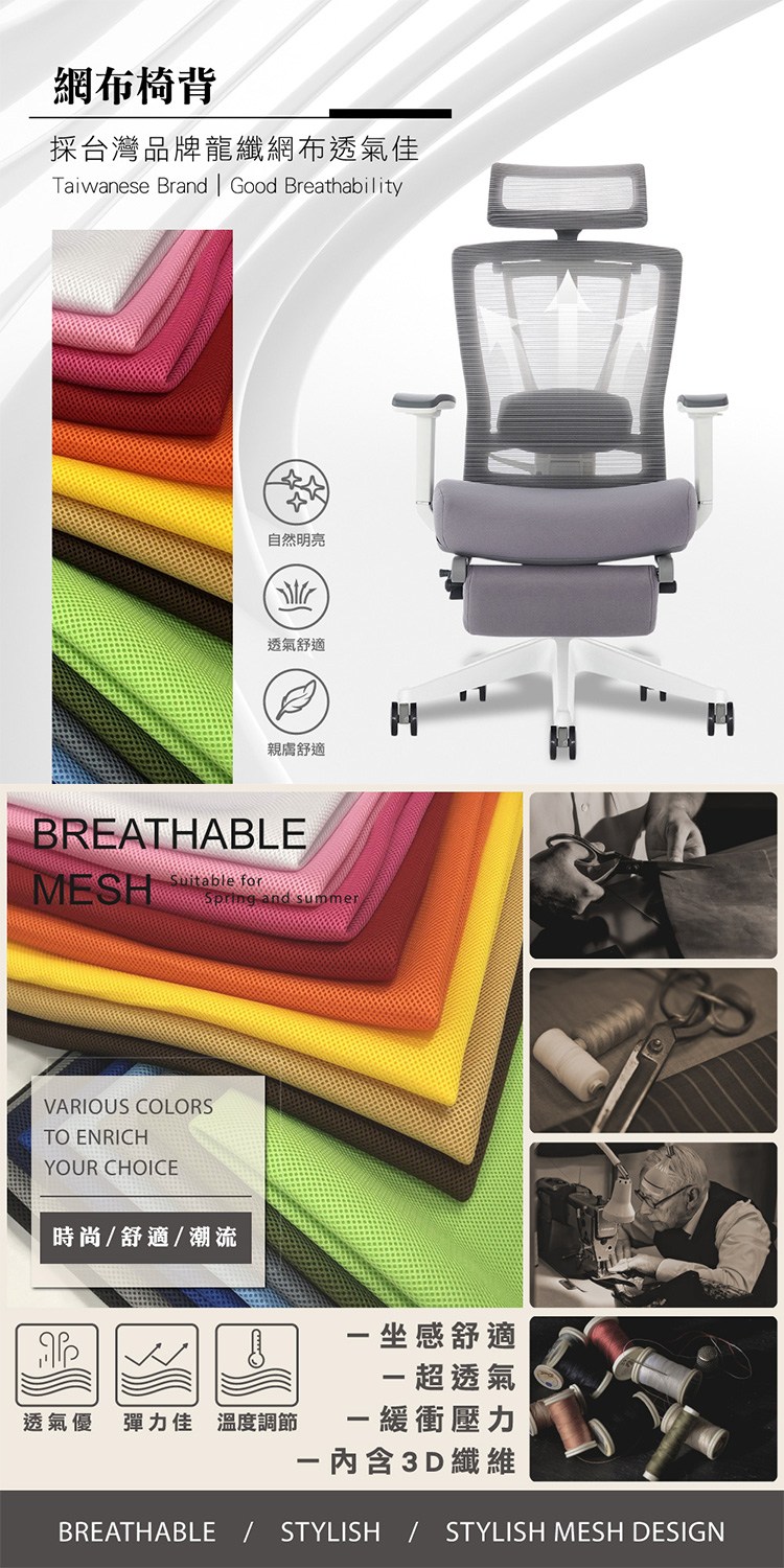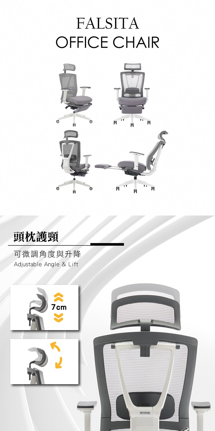 台灣與歐美同步販售、美規設計,頭枕護頸設計可微調角度與升降,椅背採台灣品牌龍纖網布透氣佳,