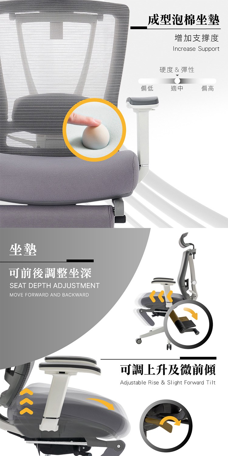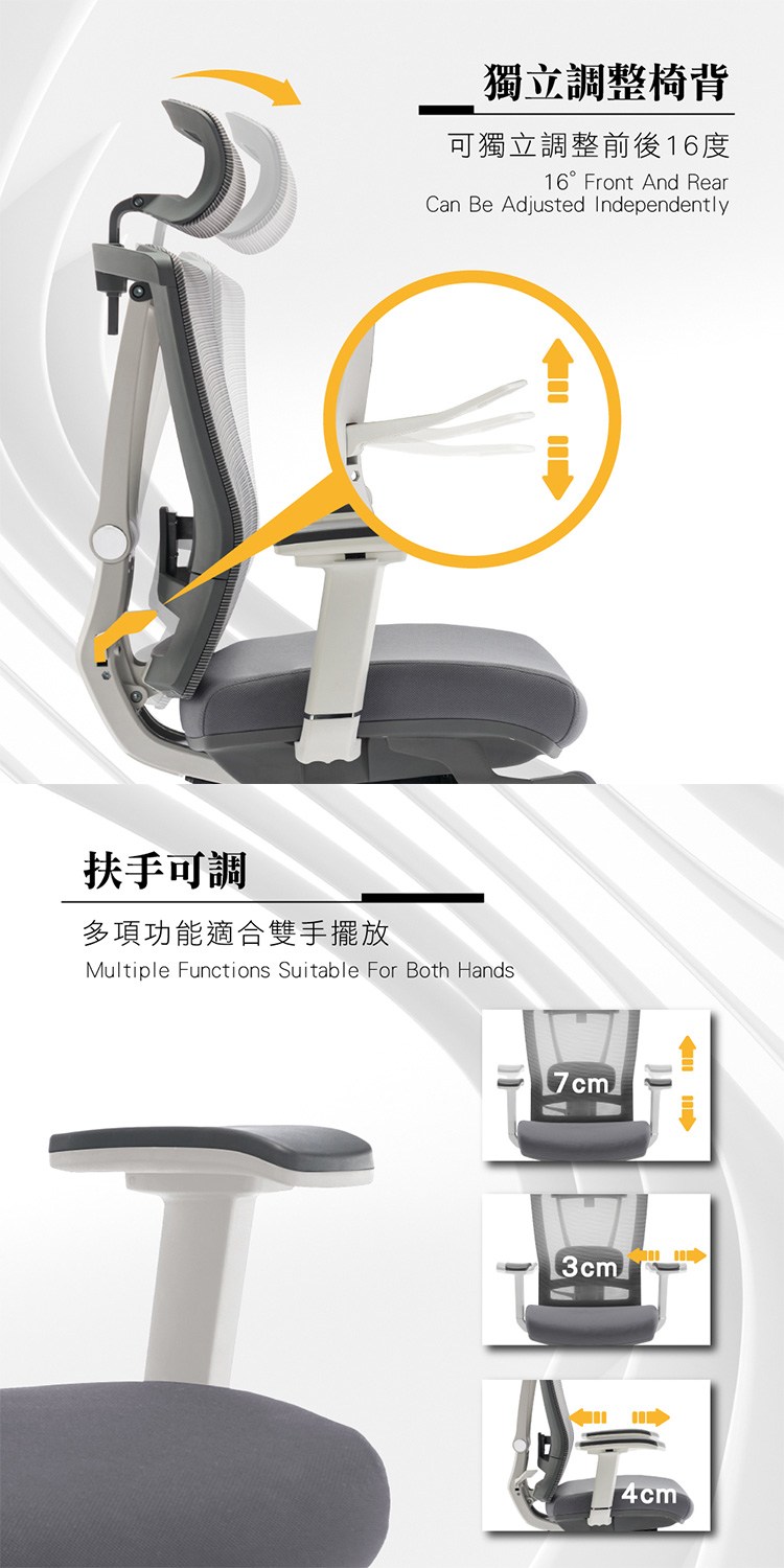 創新可以獨立調整椅背前後16度,扶手可調多項功能適合雙手擺放,透氣網布坐墊,可調節前後坐深,
