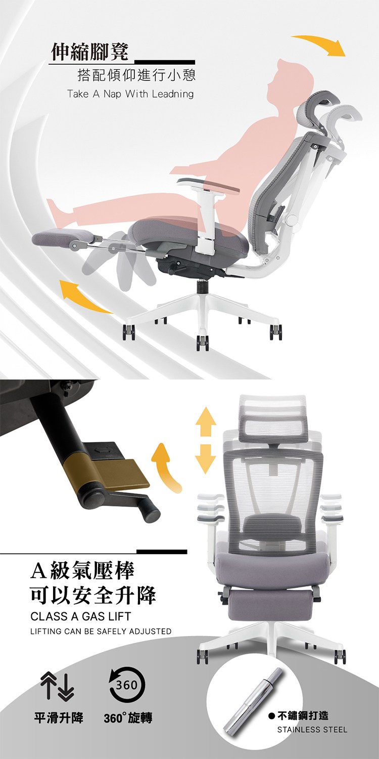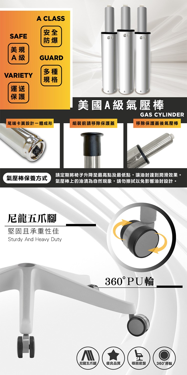 配備美規A級氣壓棒、安全升降,採尼龍五爪腳,堅固且承重性佳,360°旋轉PU輪,使用靈活機動,