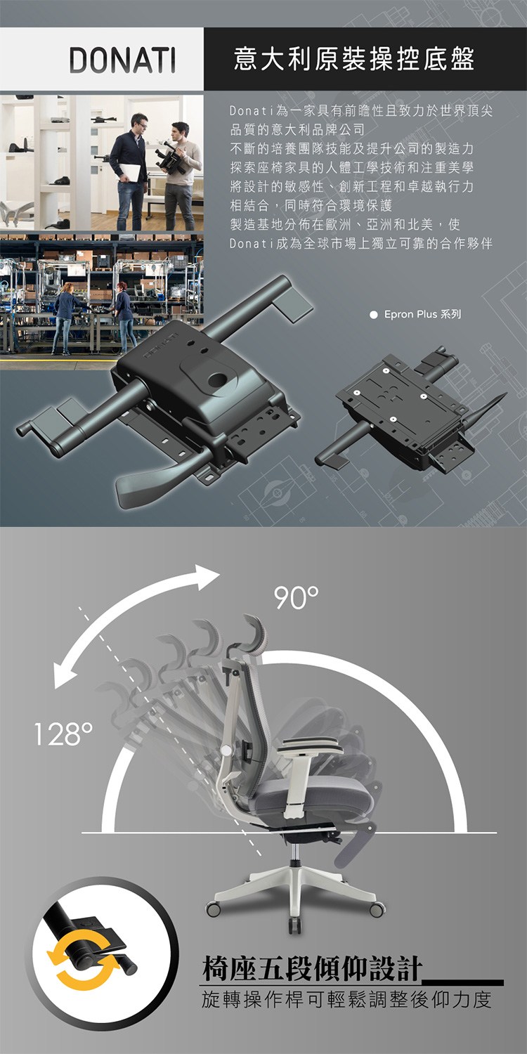意大利DONATI底盤椅背傾仰鎖定,旋轉操作桿可輕鬆調整後仰力度,含有伸縮腳凳搭配傾仰進行小憩,