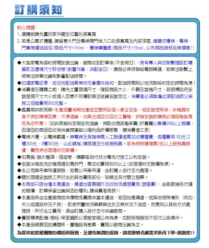 *此賣場方案-含基本拆箱定位(如需上樓,無電梯則需另收取樓層費用,請詳閱訂購須知說明~謝謝)
