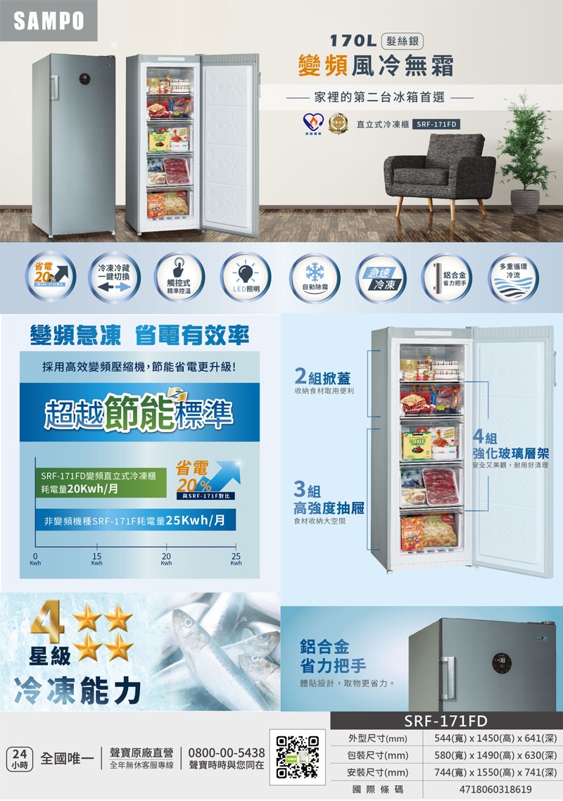 SAMPO聲寶 170公升變頻直立式冷凍櫃SRF-171FD~含拆箱定位
