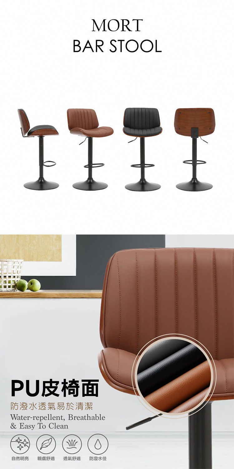 [E-home]Mort莫特PU面曲木黑漆腳可調高吧檯椅,個性與古典的結合滿足生活品味,輕鬆點綴摩登居家新亮點。
