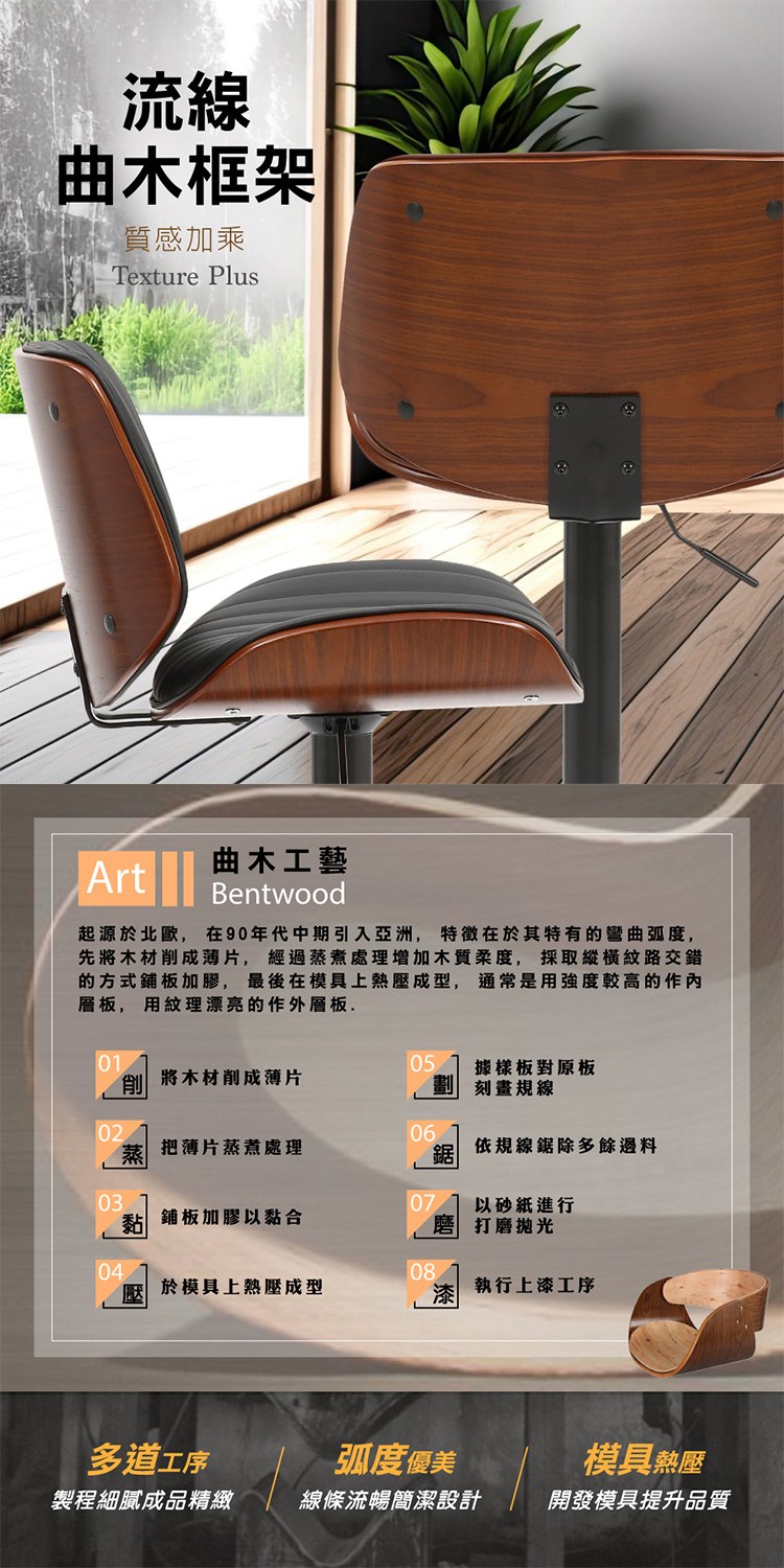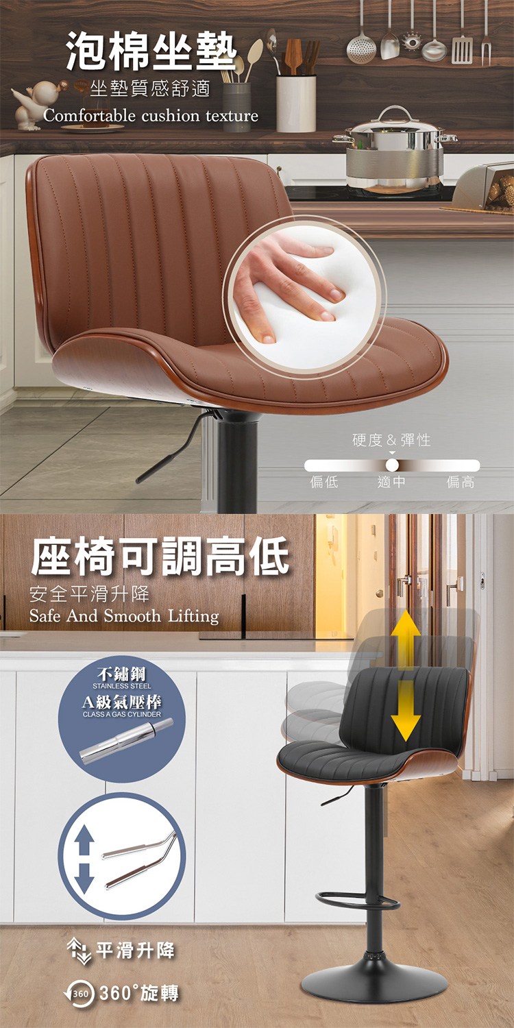 搭配獨特流線曲木框架質感加乘,高密度泡棉坐墊讓坐感更加舒適,配備美規A級氣壓棒、安全升降,