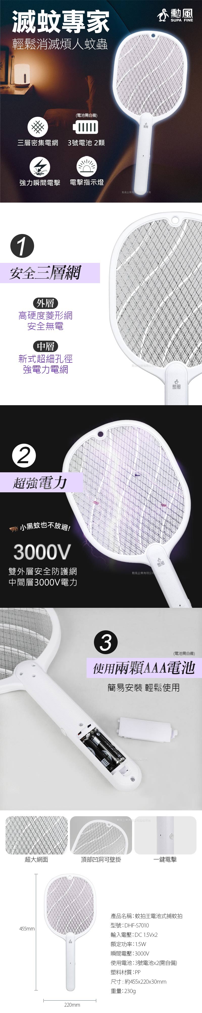 勳風 電池式三層大網面捕蚊拍 DHF-S7010