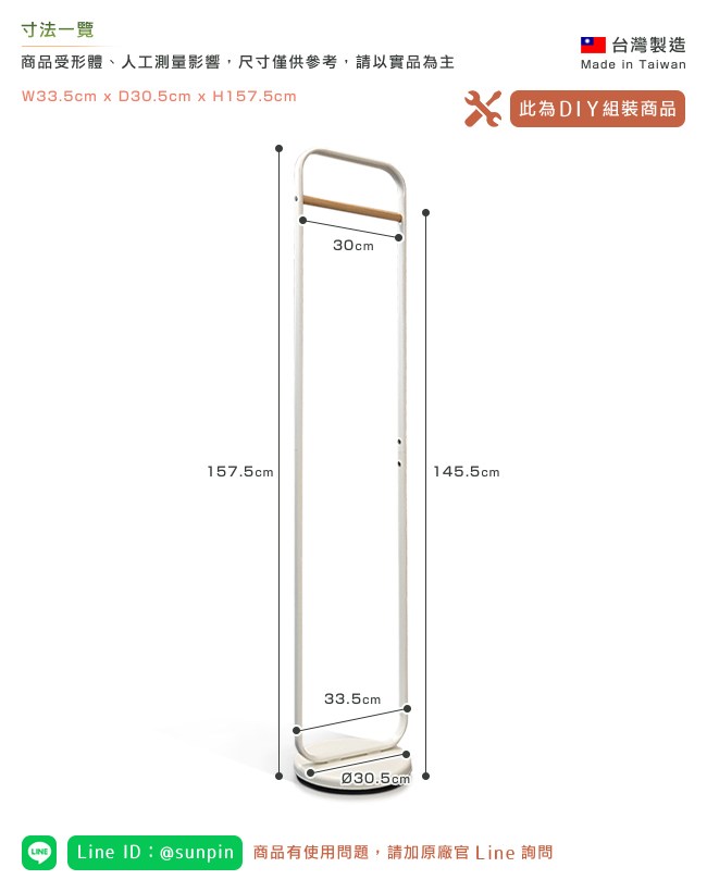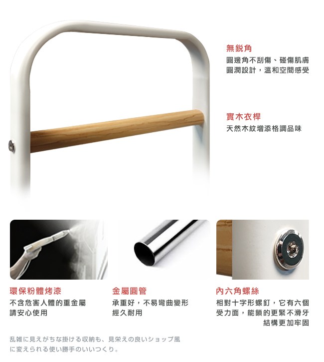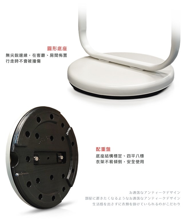 台灣製造,質感上乘。圓角邊緣不刮傷、碰傷肌膚。圓潤設計,溫和空間感受。天然木紋的實木衣桿,增添格調品味。環保粉體烤漆,不含危害人體的重金屬,請安心使用。金屬圓管承重好,不易彎曲變形,經久耐用。相對十字型螺釘,內六角螺絲有六個受力面,能鎖的更緊不滑牙,結構更加牢固。圓形底座在玄關、客廳、房間佈置時,行走不會被撞傷。配重盤讓衣架四平八穩,不易傾倒,安全使用。